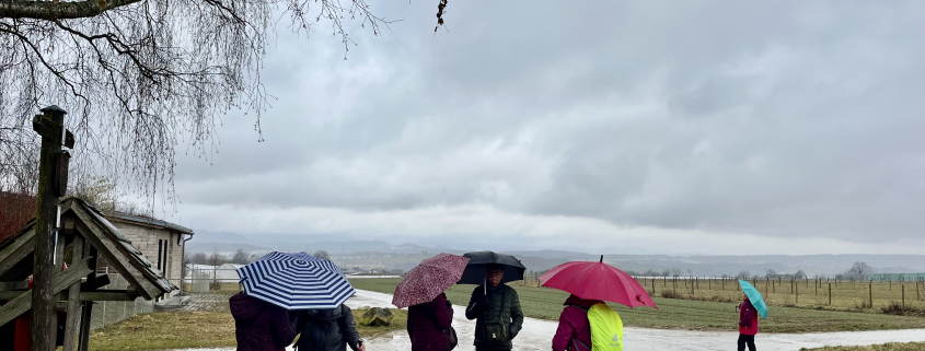Auf der Rundtour ging es über die Schillerhöhe mit Ausblick auf die Alb bis zur Alpaka-Farm und anschließend auf gut begehbaren Schotter- und Waldwegen oberhalb der wild dahinrauschenden Aich durch einen lichten Mischwald. – Der Regen tropfte beharrlich auf die Schirme, die in allen Farben leuchteten – rot, grün, pink, orange oder ganz elegant: multicolor. Ein paar graue und schwarze waren auch darunter, aber die Farbenfreude überwog. Wer sollte da an Trübsal denken? Und so war die Stimmung trotz des Nieselregenwetters heiter. Kurz vor der Alpaka-Farm kam uns eine Alpaka-Wandergruppe entgegen. Auch sie hatte das Wetter nicht abgeschreckt.