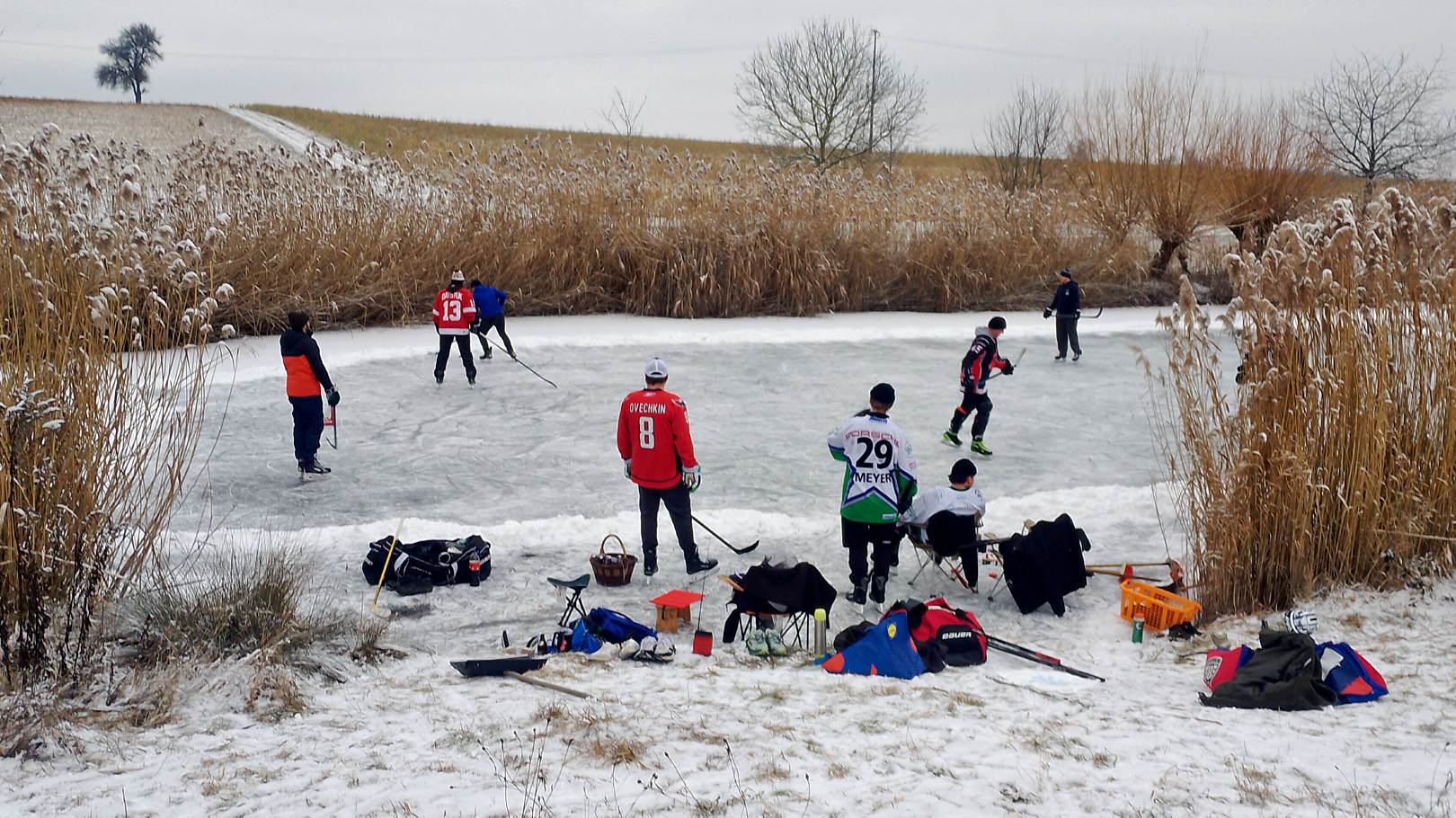 Fast schon wieder in Bissingen angelangt, erwartete uns noch ein weiteres Winterspektakel. Schon aus einiger Entfernung hörten wir, wie Eispucks hin und her geschossen wurden, und als wir näherkamen, sahen wir Kinder, die auf dem vollständig zugefrorenen kleinen Naturteich Seewälde auf ihren Schlittschuhen hin- und her flitzten, um schon mal für eine eventuelle Karriere als Eishockey-Profi zu üben.