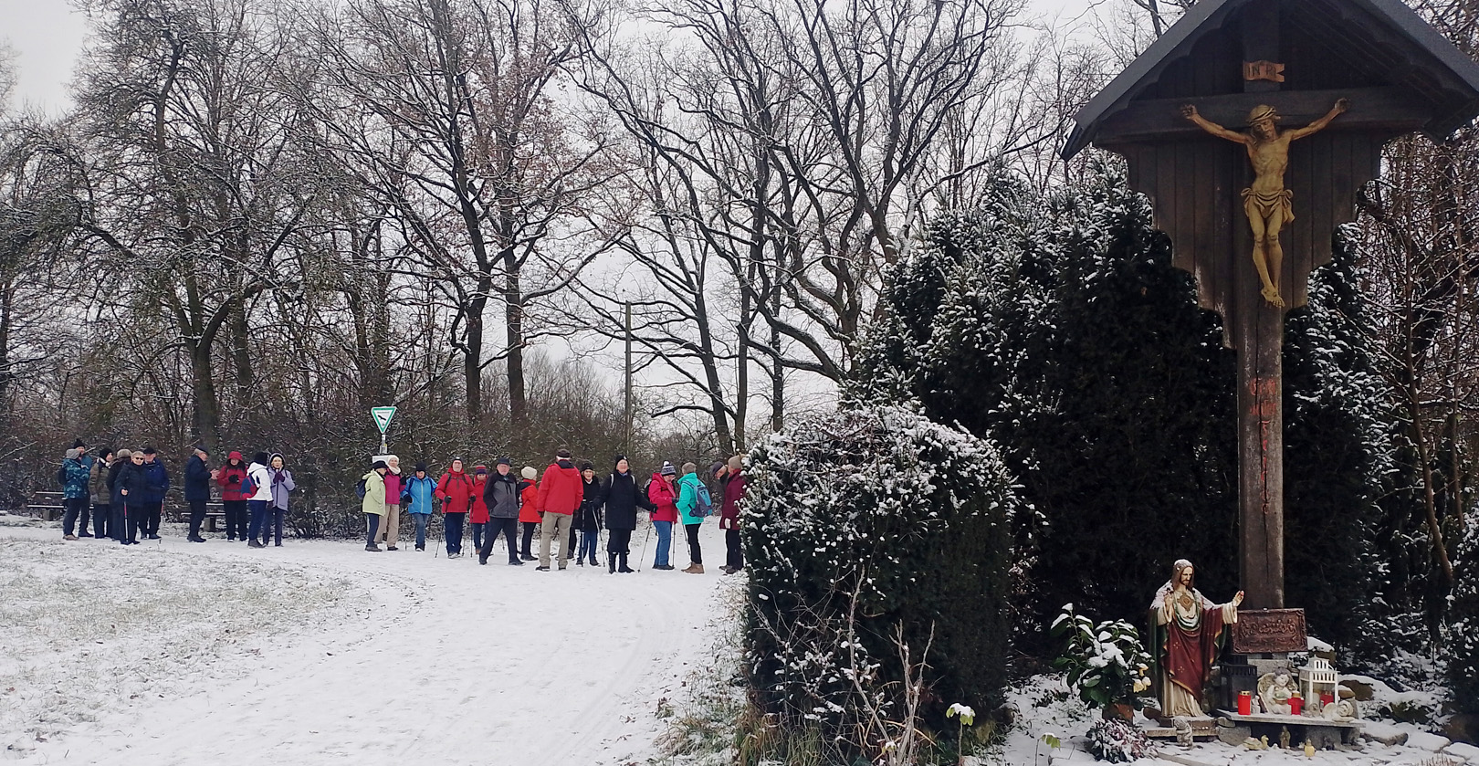 Munter wanderten wir daher, durch Wald und entlang der Wiesen und Felder rund um Bissingen – gespannt auf den angekündigten Stopp an der Obsterfassungshalle, wo unsere mitgebrachten Tassen bei Glühwein, Punsch und leckeren Kuchen – einschließlich eines frisch gebackenen Hefezopfs von Anneliese Bauer – zum Einsatz kamen. Auch den beiden anderen Bäckerinnen, Karin Meier und Karin Knäbel sei herzlich gedankt. Die Kuchen waren einfach köstlich. Nach der Stärkung ging es umso schwungvoller weiter – vorbei am Schellenhof. Von hier aus aber nicht wie geplant zur Enz hinunter, da man Glätte fürchtete, sondern nach oben abbiegend zur Friedenseiche. An diesem bedeutsamen Ort hielten wir, gerade so wie es die Inschrift auf der Tafel anmahnt, kurz inne.
