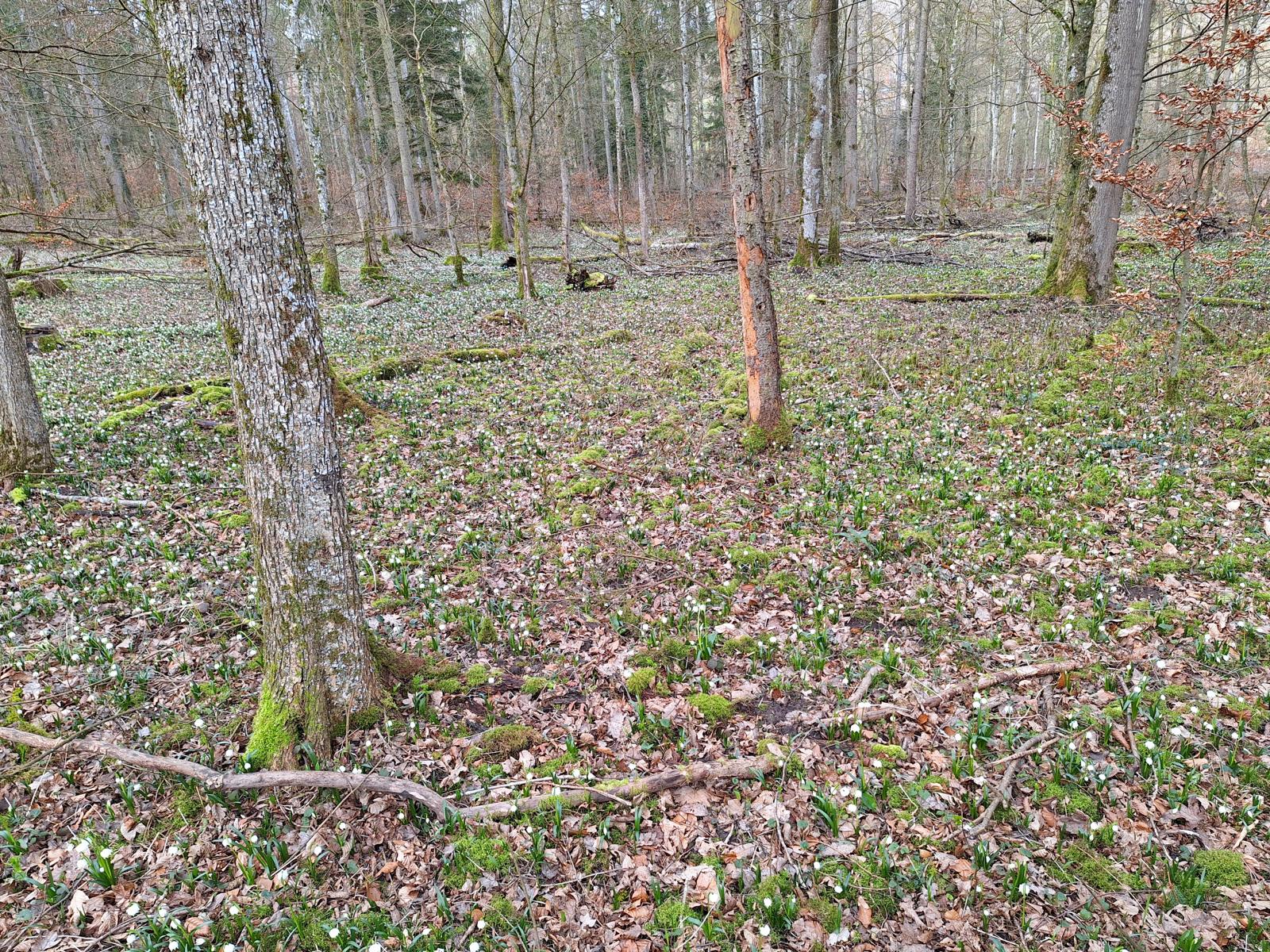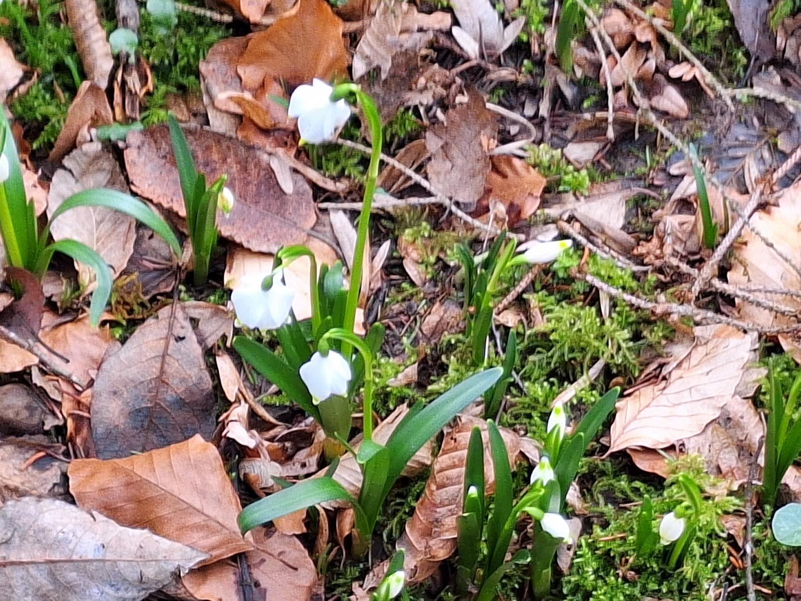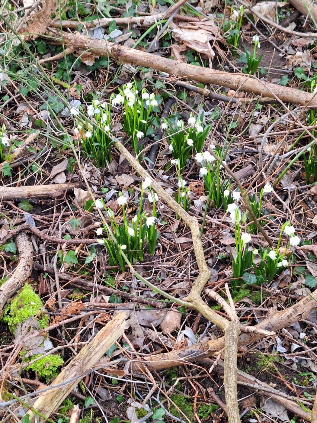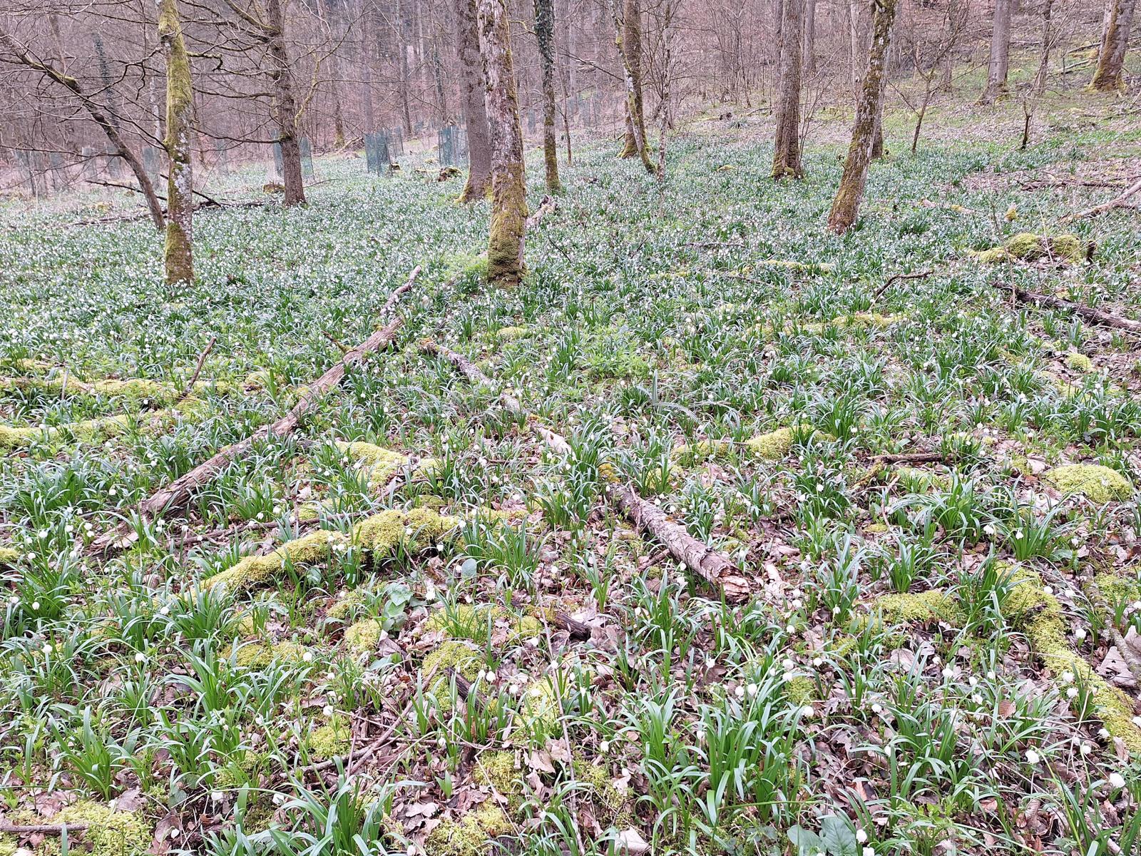 Vorbei an der stattlichen, ehemaligen Bromberger Mühle im Kirbachtal wanderten wir dahin durch die Talaue mit blühendem Schlehengebüsch, über das Tannenbrunnenbächlein und vorbei an Ochsenbach. Der munter, über bemooste Steine, dahinplätschernden Kirbach wurde überquert. Nun ging es auf schlammigen und rutschigen Weg hinauf zum Blauen Sträßle. Dem folgte die Wandergruppe bis zum Ziel der im Tiergartenwald gelegene Standort der Märzenbecher. Nun war man gespannt ob die Märzenbecher noch blühten. Auf matschigen Weg folgte man den Zaun der den Standort schützt und siehe da der Weg war nicht umsonst. Tausendfach sah man die weißen Glöckchen und die Wanderer wurden gar nicht müde diese Pracht zu fotografieren. Langsam wurde es Zeit weiter zu gehen.