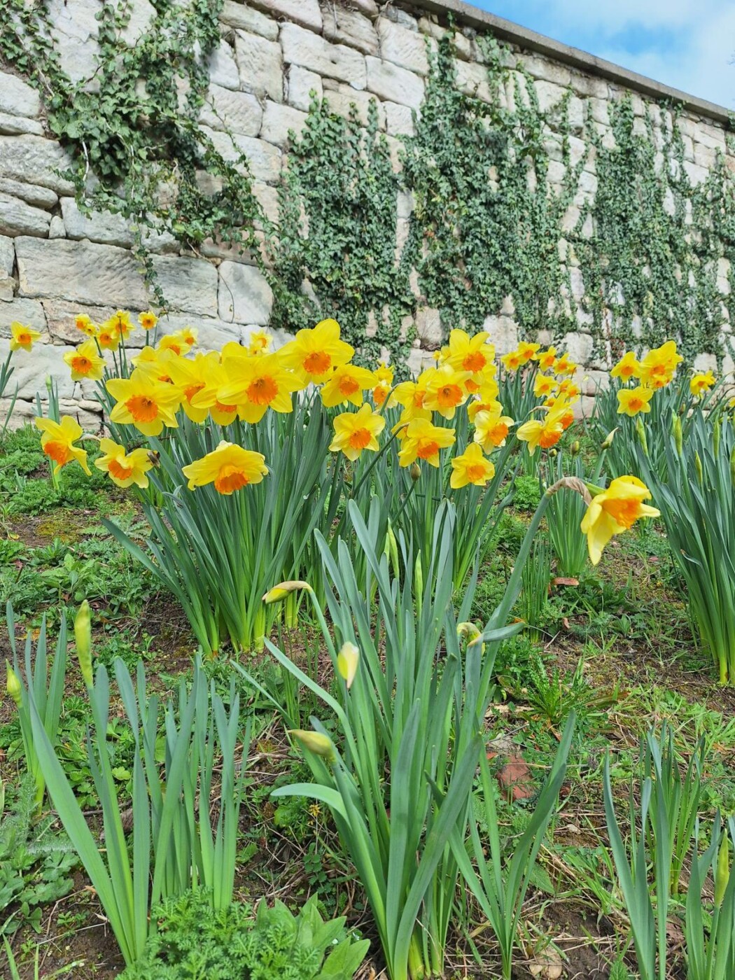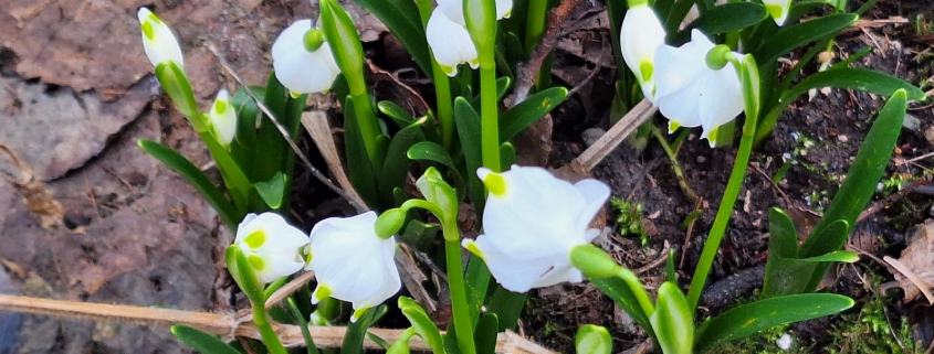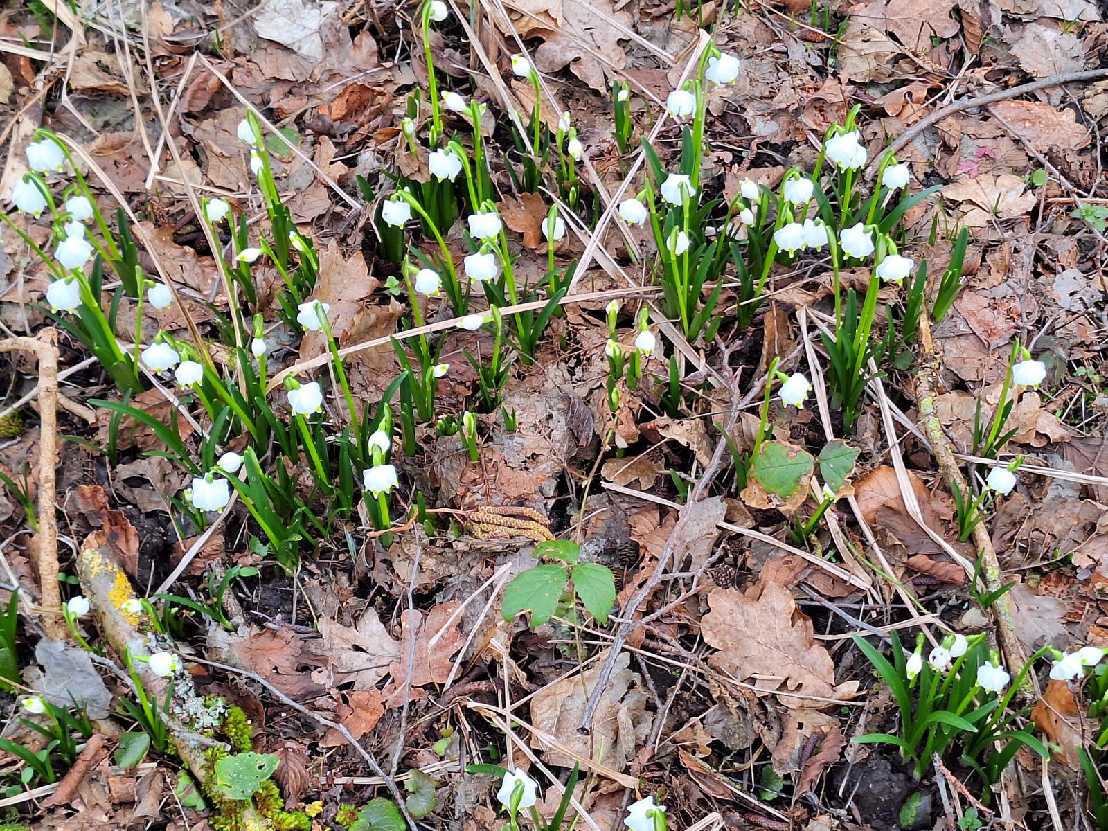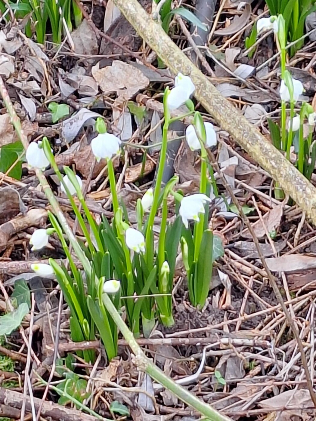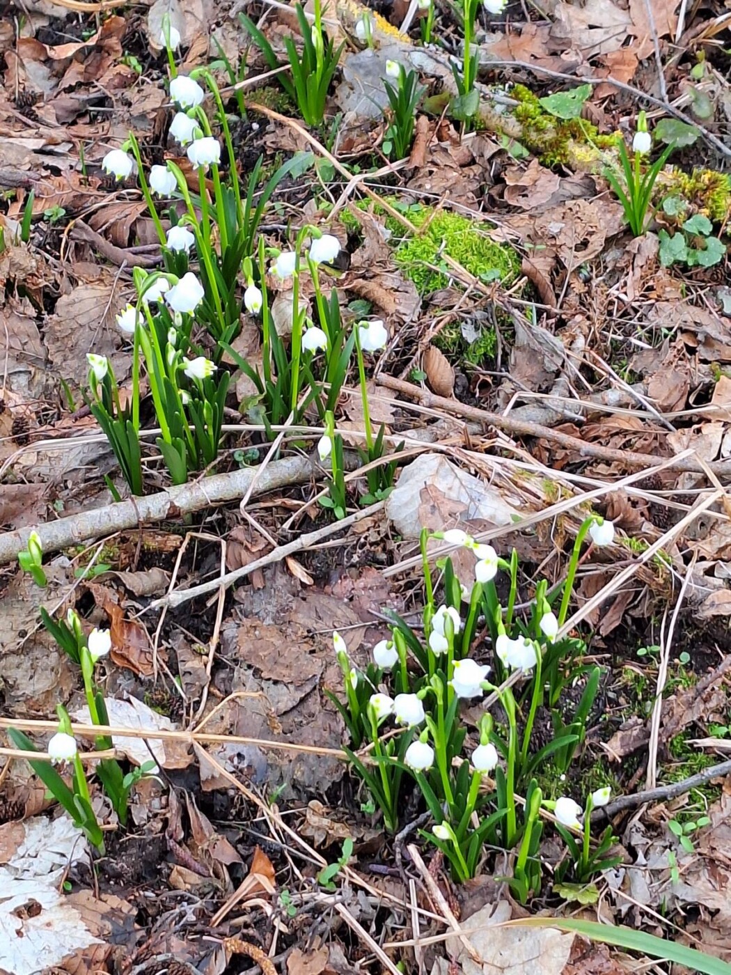 Vorbei an der stattlichen, ehemaligen Bromberger Mühle im Kirbachtal wanderten wir dahin durch die Talaue mit blühendem Schlehengebüsch, über das Tannenbrunnenbächlein und vorbei an Ochsenbach. Der munter, über bemooste Steine, dahinplätschernden Kirbach wurde überquert. Nun ging es auf schlammigen und rutschigen Weg hinauf zum Blauen Sträßle. Dem folgte die Wandergruppe bis zum Ziel der im Tiergartenwald gelegene Standort der Märzenbecher. Nun war man gespannt ob die Märzenbecher noch blühten. Auf matschigen Weg folgte man den Zaun der den Standort schützt und siehe da der Weg war nicht umsonst. Tausendfach sah man die weißen Glöckchen und die Wanderer wurden gar nicht müde diese Pracht zu fotografieren. Langsam wurde es Zeit weiter zu gehen.